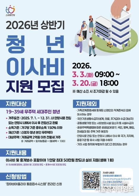 서울복지타임즈 이재연 기자 | 안양시는 청년가구의 초기 정착비용 부담 완화를 위해 이사비용을 최대 50만원까지 지원하는 ‘청년가구 이사비 지원’ 사업을 올해도 시행한다고 6일 밝혔다.