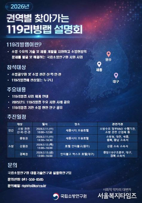 서울복지타임즈 이재연 기자 | 소방청이 국립소방연구원이 소방 기술과 제품이 실제 재난 현장에 효과적으로 적용될 수 있도록 지원하는 ‘119리빙랩(Living Lab) 사업 설명회’를 3월 11일부터 13일까지 3일간 총 네 차례에 걸쳐 개최한다고 밝혔다.