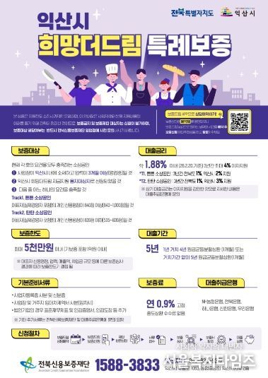 익산시 관계자는 "어려운 경제 상황에서 지역경제를 지탱하고 있는 소상공인을 위한 실질적인 금융 지원이 절실한 상황"이라며 "특례보증과 이자 지원으로 자금 부담을 완화하고, 소상공인의 경영 안정과 재도약을 뒷받침하도록 적극 지원하겠다"고 말했다.