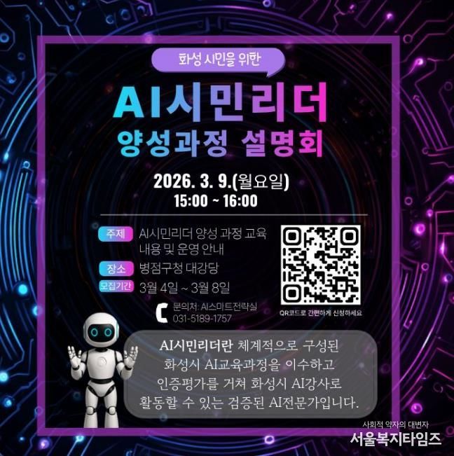 서울복지타임즈 이재연 기자 | 화성특례시는 시민이 학습하고 교육하는 인공지능(AI) 학습 체계 구축을 위해 ‘2026년 AI시민리더 양성 교육’ 설명회를 3월 9일 오후 3시에 병점구청 대강당에서 개최한다.