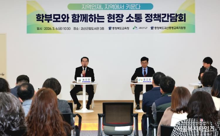 서울복지타임즈 이재연 기자 | 충북 괴산군은 6일 군립도서관 다목적홀에서 송인헌 군수와 윤건영 충북교육감이 학부모 30여 명과 함께 지역 교육 발전을 위한 간담회를 열었다고 밝혔다.