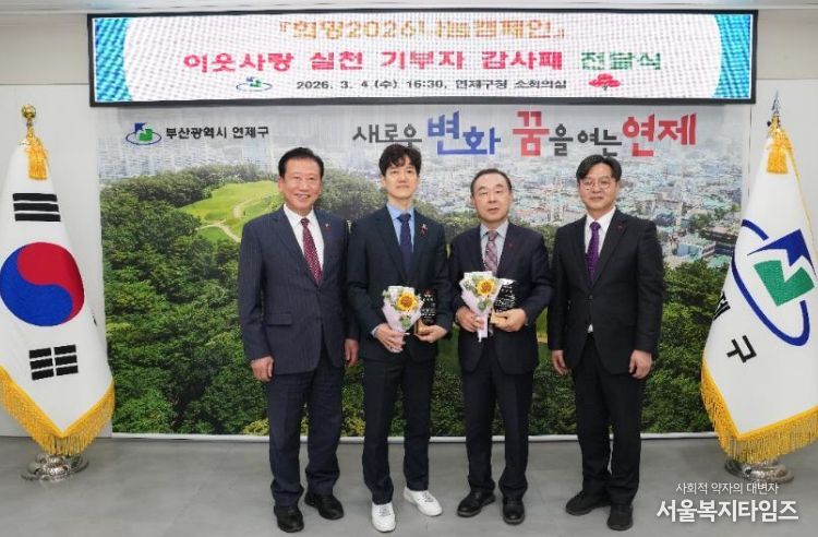 서울복지타임즈 이재연 기자 | 연제구는 지난 3월 4일, 부산사회복지공동모금회(회장 이수태)와 함께 '희망2026나눔캠페인 이웃사랑 실천 기부자'에게 감사패를 전달했다.