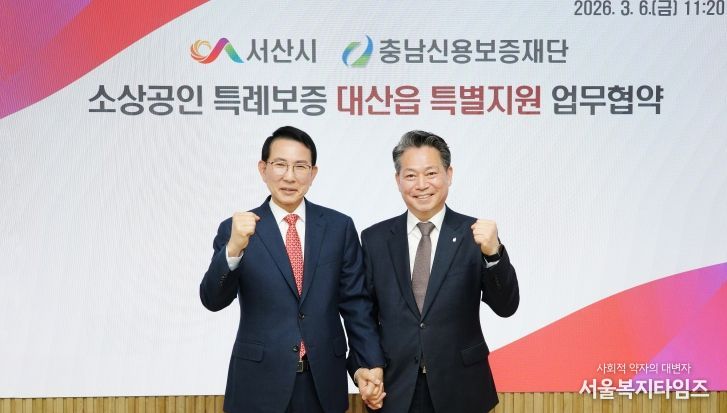 충남신보는 3월 6일 서산시청에서 조소행 충남신보 이사장, 이완섭 서산시장 등이 참석한 가운데 ‘대산읍 소상공인 특별지원 업무협약’을 체결했다고 밝혔다.