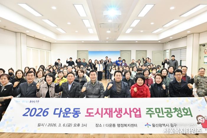 서울복지타임즈 이재연 기자 | 울산 중구가 3월 6일 오후 3시 다운동 행정복지센터 2층 강당에서 ‘다운동 도시재생 활성화계획’ 변경 수립을 위한 주민공청회를 개최했다.