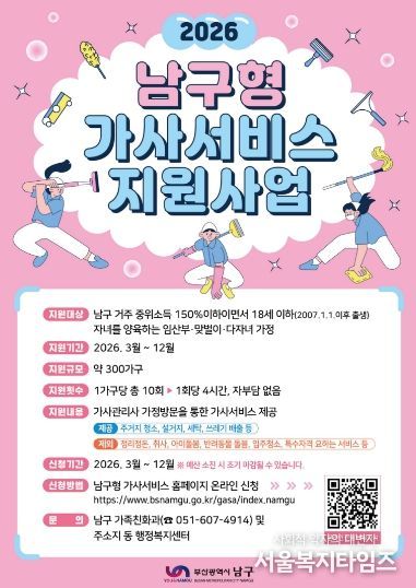 서울복지타임즈 이재연 기자 | 부산 남구는 임산부·맞벌이·다자녀 가정의 가사 부담을 완화하기 위해 '2026년 남구형 가사서비스 지원사업'을 3월 9일부터 시행한다고 밝혔다.