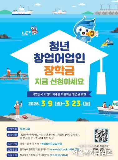 서울복지타임즈 이재연 기자 | 해양수산부는 3월 9일부터 3월 23일까지 2026년도 1학기 청년창업어업인 장학생 30명을 모집한다고 밝혔다.