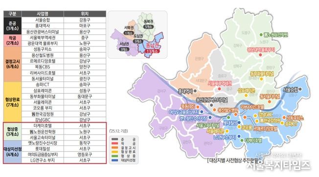 ‘사전협상제도’는 서울 전역에서 ▴준공 3개소 ▴착공 2개소 ▴결정고시 7개소 ▴협상완료 6개소 ▴협상진행 중 3개소 ▴대상지 선정 4개소가 단계별로 순항 중이다.