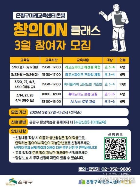 서울복지타임즈 이재연 기자 | 서울 은평구는 은평구미래교육센터 온빛에서 초등학생을 대상으로 한 체험형 AI 창의융합 교육 프로그램 ‘창의ON 클래스’ 참여자를 모집한다고 밝혔다.