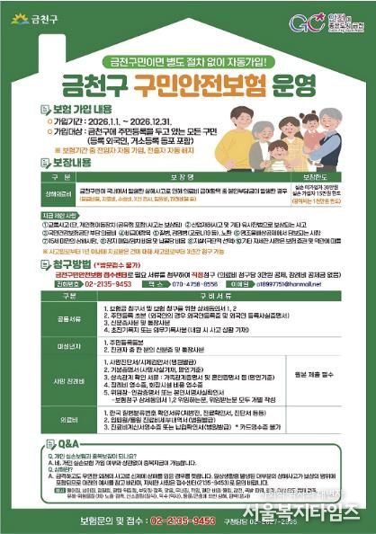 서울복지타임즈 이재연 기자 | 금천구는 2023년 하반기부터 금천구 모든 구민을 대상으로 시행하고 있는 ‘구민안전보험’을 올해부터 일부 보장 기준을 개선해 운영한다고 밝혔다.