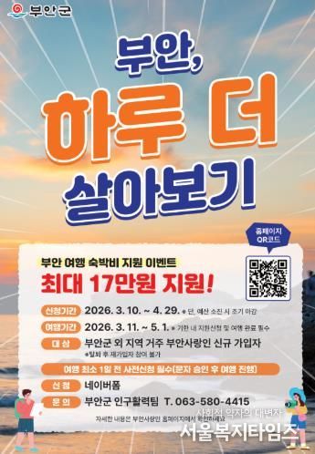 서울복지타임즈 이재연 기자 | 부안군은 관광객 체류시간 확대와 지역 상권 활성화를 위해 ‘부안, 하루 더 살아보기’ 이벤트를 추진한다고 밝혔다.