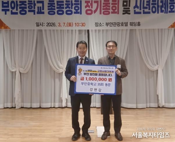 서울복지타임즈 이재연 기자 | 부안군은 지난 7일 부안관광호텔에서 열린 부안중학교 총동창회 정기총회에서 35회 강현갑 동문이 고향사랑기부금 100만원을 기탁했다고 밝혔다.