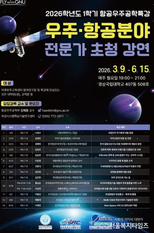 서울복지타임즈 이재연 기자 | 경상국립대학교 위성시스템핵심기술연구센터는 3월 9일부터 6월 15일까지 13차례에 걸쳐 우주‧항공 분야 전문가 초청강연을 진행한다.