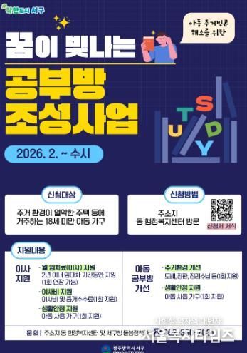 서구는 아동주거빈곤가구의 생활환경을 개선하고 안정적인 성장 기반을 마련하기 위한 ‘꿈이 빛나는 공부방’ 조성사업을 올해도 추진한다고 9일 밝혔다