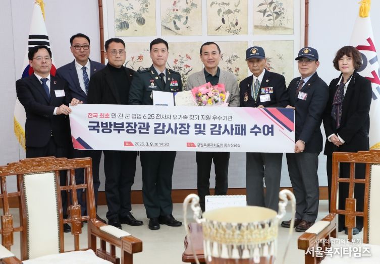 서울복지타임즈 이재연 기자 | 강원특별자치도는 국방부 유해발굴감식단이 추진한 ‘2025년 민·관·군 협업 6·25전사자 유가족 집중 찾기’ 사업에서 전국 최초 민관군 협업 6.25전사자 유가족 찾기 지원 우수기관으로 선정돼, 3월 9일 국방부장관으로부터 감사장과 감사패를 수상했다고 밝혔다.