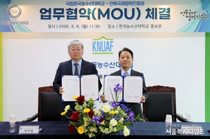 서울복지타임즈 이재연 기자 | 한국농수산대학교는 3월 9일 오전 11시 한농대 본관에서 전북국제협력진흥원과 국제농업교육 협력 등을 위한 업무협약을 체결했다.