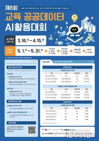 참가자들은 교육 공공데이터를 활용해 학교생활·학습·안전 등 교육 현장의 문제를 해결할 수 있는 인공지능(AI) 기반 서비스 아이디어를 기획· 제안하게 된다.