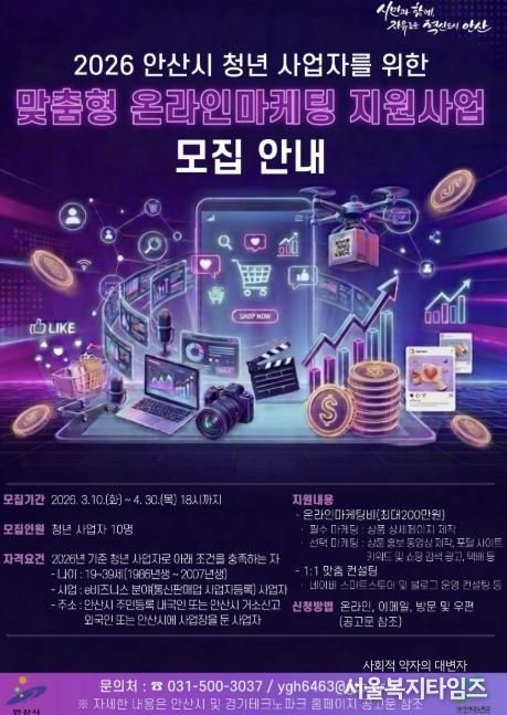 서울복지타임즈 이재연 기자 | 안산시는 온라인 시장에서 상품 홍보와 매출 확대를 희망하는 청년 사업자를 대상으로 ‘맞춤형 온라인마케팅 지원사업’ 참여자를 모집한다고 11일 밝혔다.