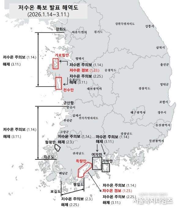 서울복지타임즈 이재연 기자 | 해양수산부는 3월 11일 12시부로 저수온 특보를 전면 해제하고, 위기경보 단계를 ‘경계’에서 ‘관심’으로 하향한다고 밝혔다.