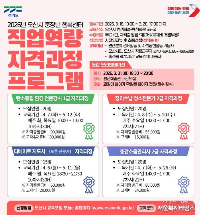 서울복지타임즈 이재연 기자 | 오산시는 중장년층의 경제활동 참여 확대와 사회공헌 기회 제공을 위해 ‘2026년 오산시 중장년 행복센터 직업역량 자격과정 프로그램’ 수강생을 모집한다고 밝혔다.