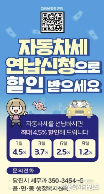 서울복지타임즈 이재연 기자 | 당진시는 오는 31일까지 2026년 3월 자동차세 연납 신청을 받는다고 12일 밝혔다.
