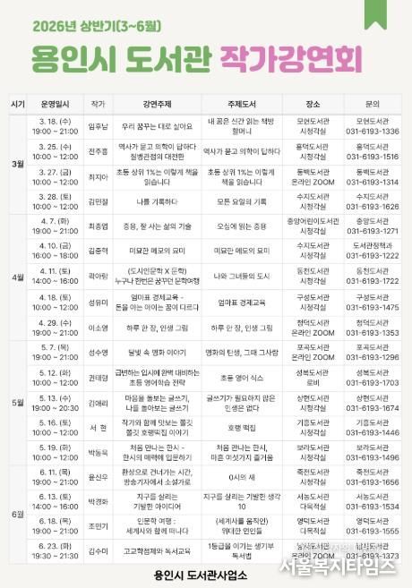 5월에는 7일 '명화의 탄생 그때 그 사람’의 저자 성수영 한국경제 기자(포곡도서관), 12일 '초등 영어 식스'의 저자 권태형 작가(성복도서관), 13일 '글쓰기가 필요하지 않은 인생은 없다'의 저자 김애리 작가(상현도서관), 16일 ‘호랭 떡집’의 저자 서현 작가(기흥도서관), 19일 ‘처음 만나는 한시 마흔 여섯가지 즐거움‘의 저자 박동욱 한양대 교수(보라도서관)가 강연할 예정이다.