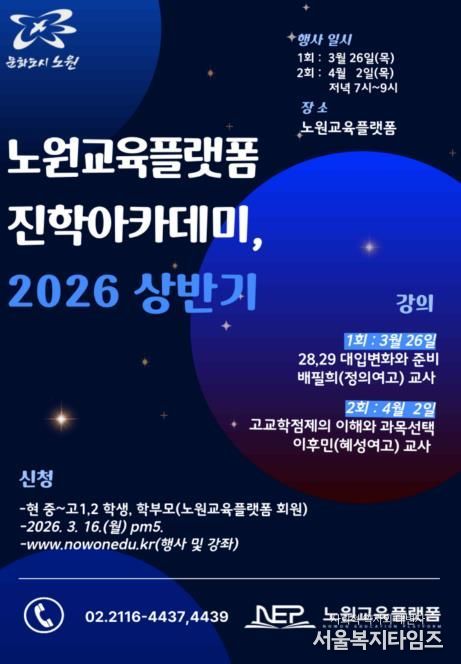 서울복지타임즈 이재연 기자 | 서울 노원구는 공신력 있는 교육 정보 제공을 위해 ‘2026년 상반기 노원교육플랫폼 진학아카데미’를 운영한다고 밝혔다.