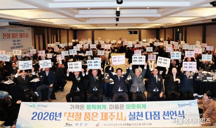 서울복지타임즈 이재연 기자 | 제주시는 11일 메종글래드 제주에서 열린 한국외식업중앙회 제주특별자치도지회 제주시지부 정기총회에서 ‘친절 품은 제주시: 정직한 가격, 따뜻한 마음’ 실천 다짐 선언식을 개최했다.
