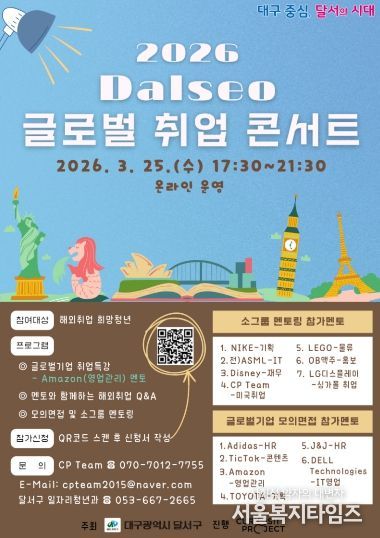 서울복지타임즈 이재연 기자 | 대구 달서구는 해외취업을 희망하는 청년들의 글로벌 역량을 강화하고 해외 진출 기회를 확대하기 위해 3월 25일‘2026년 Dalseo 글로벌 취업콘서트’를 온라인으로 개최한다.
