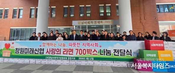 서울복지타임즈 이재연 기자 | 창원시특례시는 12일 경남사회적경제혁신타운 중앙광장에서 창원미래신협이 (사)경남사회적기업협의회 창원지부에 관내 취약계층을 위한 라면 700박스 기탁 행사를 진행했다고 밝혔다.