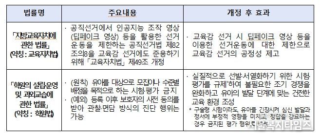 교육부는 이번 법률 개정을 통해, 공직선거에서 인공지능 조작 영상(딥페이크 영상) 등을 활용한 선거운동을 제한하는 '공직선거법' 제82조의8을 교육감 선거에도 준용하여 교육감 선거의 공정성을 높이고자 했다.