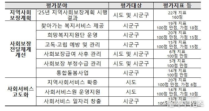 서울복지타임즈 이재연 기자 | 보건복지부는 '통합돌봄사업', '찾아가는 보건복지서비스 제공', '고독·고립 예방 및 관리', '지역사회서비스 확충' 등 총 10개 분야에 대해 지방자치단체(시도 및 시군구)를 대상으로 2026년 지역복지사업 평가를 실시한다고 밝혔다.