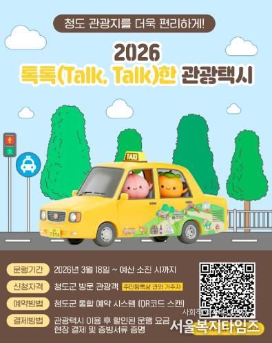 서울복지타임즈 이재연 기자 | 청도군은 개별 여행객 증가 등 관광 트렌드 변화에 대응하고 관광객의 이동 편의를 높이기 위해 오는 3월 18일부터 “2026년 청도군 톡톡(Talk, Talk)한 관광택시” 사업을 본격 운영한다.