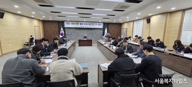 군은 지난 13일 군청 2층 소회의실에서 TF단장인 부군수 주재로 하천·계곡 주변 불법 점용시설 정비를 위해 관련 부서 및 읍·면 팀장과 담당자 등이 참석해 전수조사 추진 방안과 정비 계획을 공유했다. 이번 조치는 최근 국무회의에서 제시된 대통령 지시사항에 따른 후속 대응으로 마련됐다.