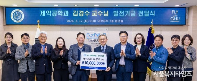 서울복지타임즈 이재연 기자 | 경상국립대학교는 3월 17일 오전 9시 30분 대학본부 3층 접견실에서 김경수 국제협력부처장(제약공학과 교수)의 대학발전기금 전달식을 개최했다.