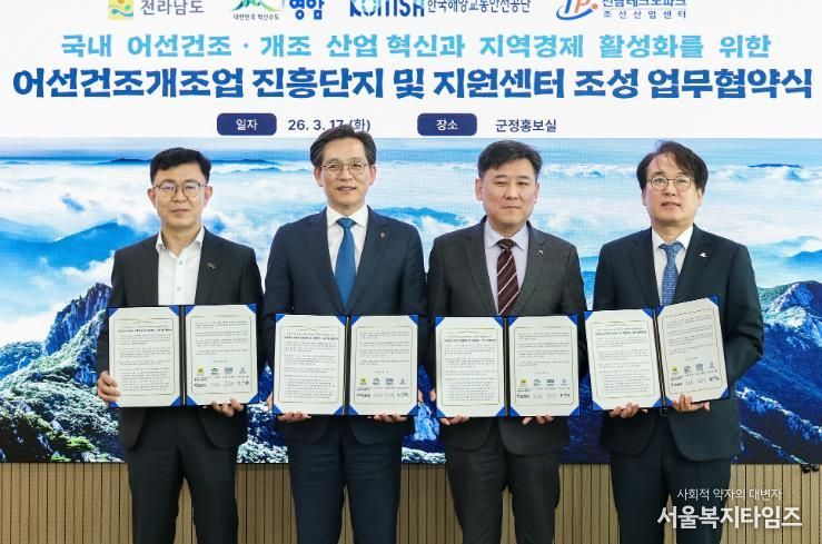 서울복지타임즈 이재연 기자 | 영암군이 17일 군청에서 전라남도, 한국해양교통안전공단, 전남테크노파크와 ‘어선 건조·개조업 진흥단지 및 지원센터 조성 업무협약’을 체결하고, 성공 운영을 위해 상호 협력을 약속했다.