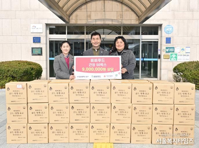 서울복지타임즈 이재연 기자 | 비비푸드가 3월 17일 오전 11시 중구청 구청장실을 찾아 울산사회복지공동모금회를 통해 이웃돕기 후원 물품으로 900만 원 상당의 배로 만든 간장 600병을 전달했다.