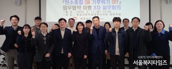 서울복지타임즈 이재연 기자 | 경상남도는 17일 오후 2시 경남사회적경제혁신타운 대회의실에서 한국농어촌공사, 한국산업단지공단, 한국남동발전 등 협약기관 실무자들이 참석한 가운데 ‘탄소중립 ON 기후위기 OFF’ 업무협약 이행을 위한 3차 실무회의를 개최했다고 밝혔다.