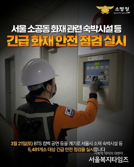 서울복지타임즈 이재연 기자 | 서울 소공동 화재 관련 숙박시설 등 긴급 화재 안전점검 실시