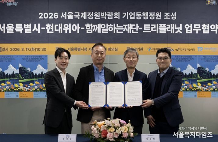 서울복지타임즈 이재연 기자 | 서울시는 현대위아, 함께일하는재단, 트리플래닛과 5월 1일 개막하는 ‘2026 서울국제정원박람회’의 기업동행정원 업무협약(MOU)을 3월 17일 서울시청에서 체결했다.