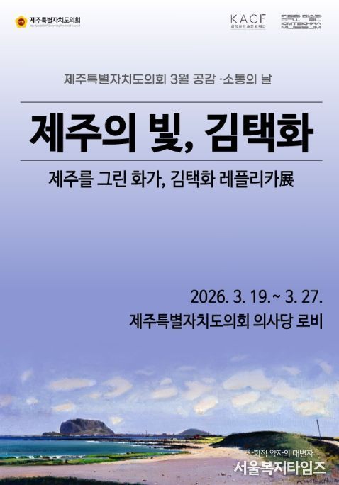 서울복지타임즈 이재연 기자 | 제주특별자치도의회는 3월 19일부터 27일까지 도의회 의사당 로비에서 제주 출신 화가 김택화(1940~2006) 화백의 작품을 소개하는 ‘제주의 빛 김택화’ 레플리카전을 개최한다. 이번 행사는 '3월 공감·소통의 날' 행사와 연계해 마련됐으며, 도민 누구나 무료로 관람할 수 있다.