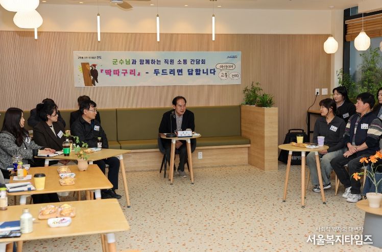 간담회에서는 사전에 접수한 질문과 현장 질문을 통해 조직문화, 근무 환경, 업무 개선 등 다양한 주제의 대화가 이어졌으며, 직원들은 평소에 업무를 하며 느꼈던 애로사항과 복지, 근무 여건에 대한 의견, 군정 운영에 대한 다양한 의견 등을 자유롭게 제시했다.