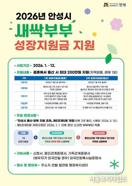 서울복지타임즈 이재연 기자 | 안성시는 3월 13일'안성시 출산·양육 지원 조례'일부개정을 통해 새싹부부성장지원금 연령 기준(49세이하 신혼부부)을 폐지하여 지원 대상을 확대했다.