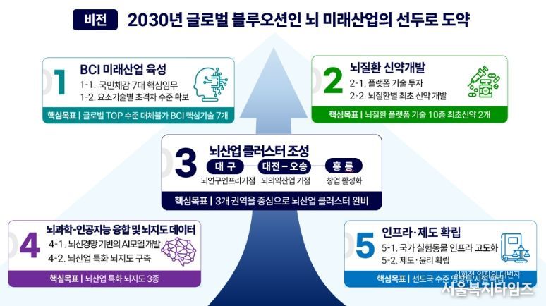 세계적 수준으로 성장한 국내 대표 뇌 연구기관을 거점으로 지역의 뇌 산업 산학협력 지구(클러스터) 성장을 지원한다. 한국뇌연구원이 소재한 대구 권역은 국내 뇌 연구 기반 시설(인프라)을 집적하고, 오송-대전 권역에는 한국생명공학연구원, 한국과학기술원(KAIST) 등 대전의 정부 출연연과 오송 생명 공학(바이오) 산업 산학협력 지구(클러스터) 간 개방형 가치 사슬(밸류채인)을 구축한다.