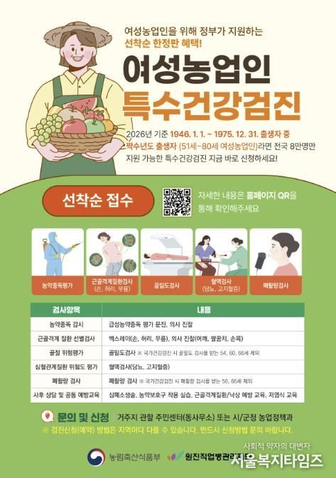 군은 오는 4월 10일까지 관내 거주하는 만 51~80세(1946년 1월 1일~1975년 12월 31일) 사이의 짝수 연도 출생 여성농업인 530여 명을 대상으로 건강검진 지원 신청을 주소지 읍·면 행정복지센터를 통해 접수하고 있다.