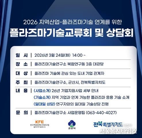 서울복지타임즈 이재연 기자 | 군산시는 오는 24일 전문 연구기관인 플라즈마기술연구소에서 도내 기업을 대상으로 ‘지역산업-플라즈마 기술 연계를 위한 기술교류회 및 상담회’를 개최한다고 18일 밝혔다.