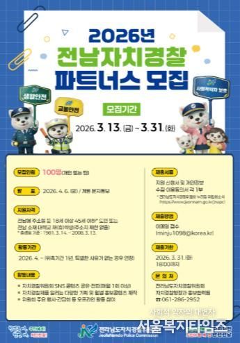 서울복지타임즈 이재연 기자 | 전라남도자치경찰위원회는 도민과의 소통을 강화하고 현장 중심 자치경찰 치안 활동을 함께할 ‘2026년 전남자치경찰 파트너스’를 31일까지 모집한다고 밝혔다.