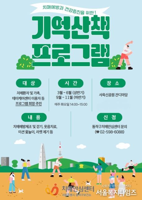 서울복지타임즈 이재연 기자 | 동작구는 구민들의 치매 예방과 건강증진을 위해 걷기 기반 통합 건강관리 프로젝트 ‘기억산책’을 운영한다고 밝혔다.