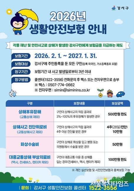 서울복지타임즈 이재연 기자 | 서울 강서구는 일상생활 속 예기치 못한 사고로부터 구민을 보호하기 위해 '2026년 강서구민 생활안전보험'을 운영한다고 밝혔다.