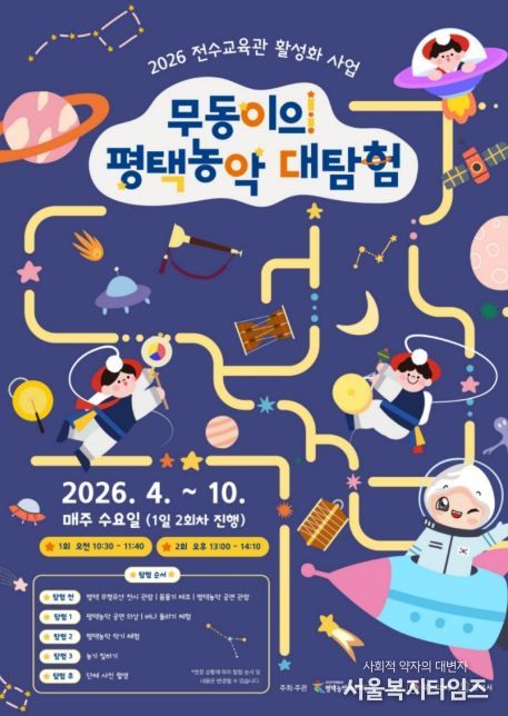 서울복지타임즈 이재연 기자 | 평택시는 오는 4월 29일부터 10월 28일까지 2026년 전수교육관 활성화 지원사업 ‘무동이의 평택농악 대탐험’을 평택무형유산 전수교육관에서 매주 수요일, 1일 2회차 총 38회를 운영한다고 밝혔다.