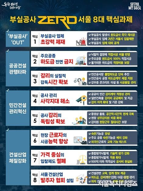오세훈 서울시장은 “최근 지하주차장 붕괴와 같이 시민을 큰 불안에 빠뜨린 부실공사의 고리를 끊어내고 건설산업의 재도약을 도울 종합 개선대책을 마련했다”며 “세계적으로 인정받는 우리 건설기술과 산업에 근본적인 변화를 이끌어내 안전하고 매력 넘치는 ‘글로벌 안전도시’를 만들어 나갈 것”이라고 말했다.